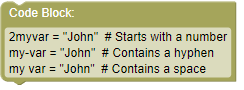 - A variable name can only contain alpha-numeric characters and underscores (A-z, 0-9, and _ ).