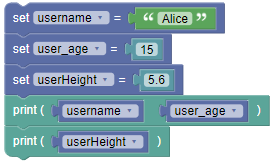 username = "Alice" user_age = 15 userHeight = 5.6 print(username, user_age) print(userHeight)- Output: